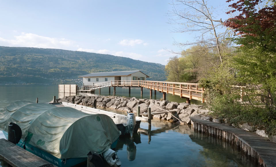ein steg geht vom park des von rütte gut aus übers wasser zum neuen seehaus,
