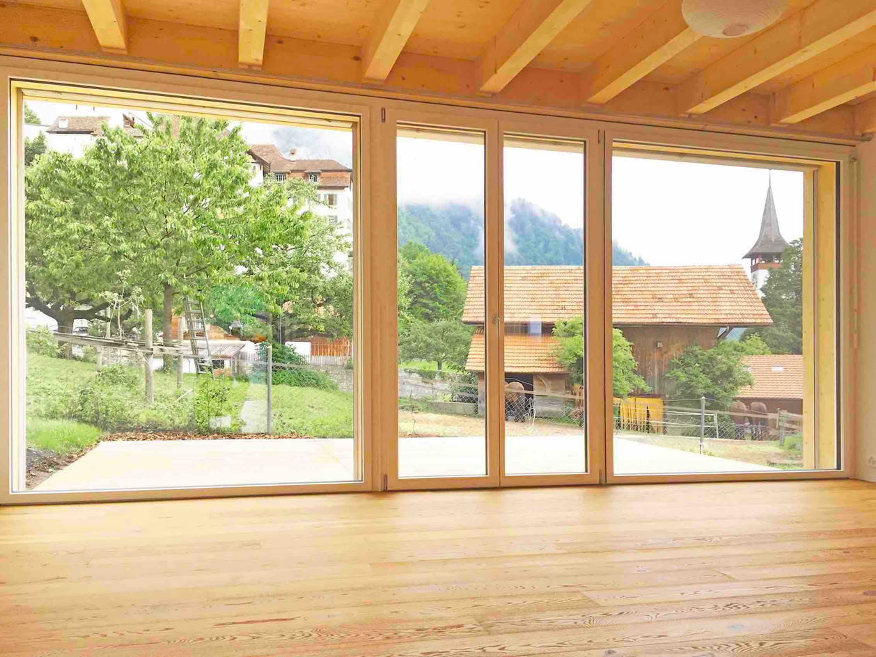 die zwei neuen doppelhäuser aus holz stehen im oberdorf von wimmis.